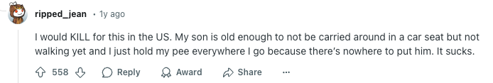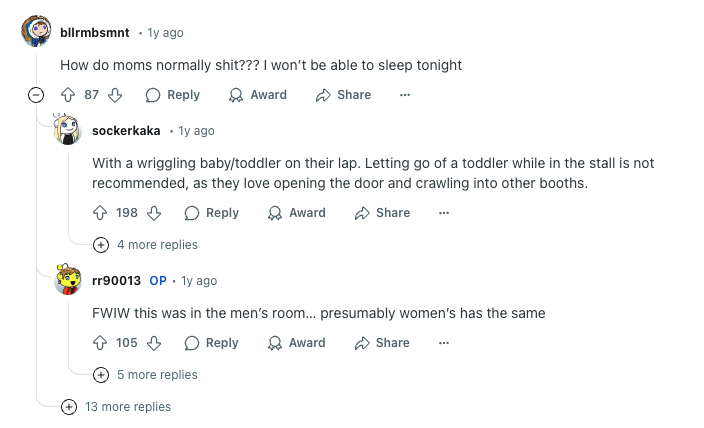 We're not even talking about changing tables here (though yes, dads and changing tables deserve their own conversation). This is about that basic human need: when you have to go, but you're with your baby. Sure, some little ones might still be in strollers—assuming the stroller even fits through the door. But what about that toddler who sees every public bathroom as an exciting new adventure space? I'll leave just a few Reddit comments here (because I'm sure you can find many more) that perfectly capture this universal struggle.